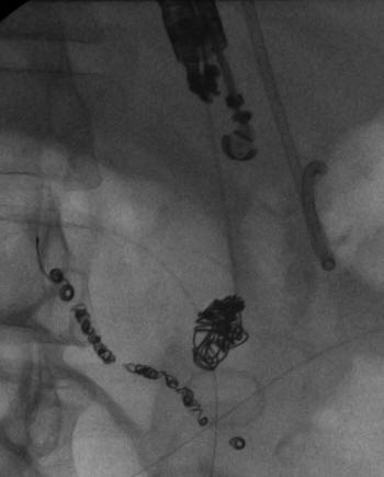 Coils of an iatrogenic left subclavian fistula caused by Cook embolization coils (38-5-12) were inserted (Fig. 2c). This resulted in formation of thrombus in the aneurysm, and an immediate decrease in the venous collaterals. ... Return Document